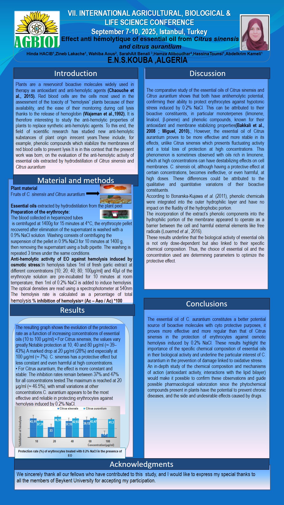 Effect anti hémolytique of essential oil from Citrus sinensis and citrus aurantium - Hacib Hinda, Lakache Zineb, Wahiba Aous, Ait-Benali Sarah, Aliboudhar Hamza, Tounsi Hassina, Abdelkrim Kameli